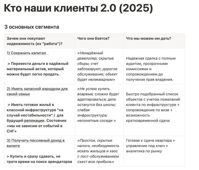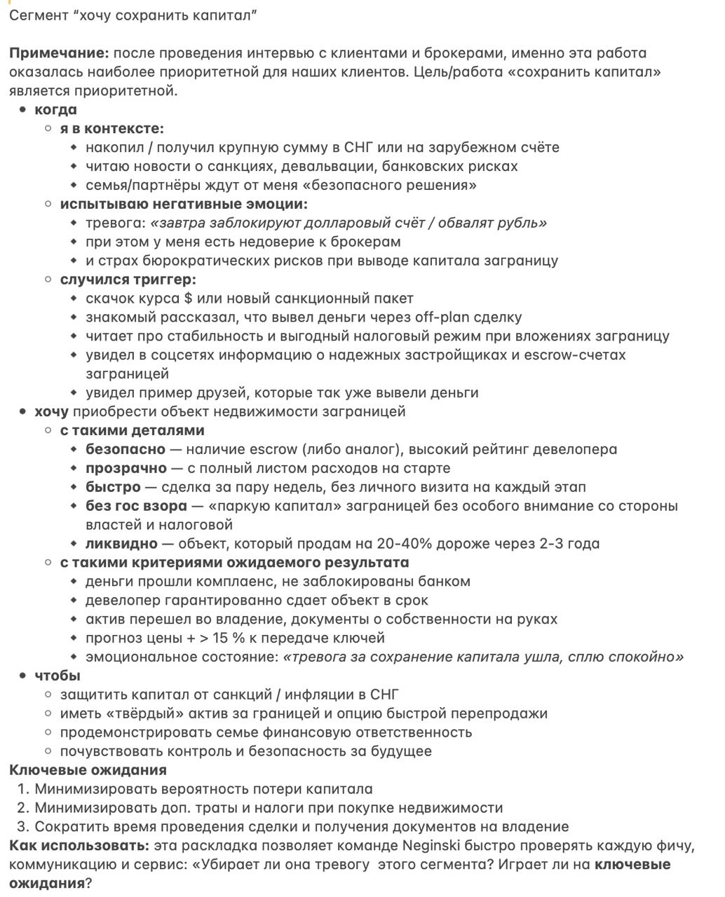 Когда я углубился еще сильнее, выяснилось, что у всех сегментов есть важная дополнительная джоба, постпродажное обслуживание: чтобы агентство, где они купили недвижимость, помогло с «постпродажкой» и оформлением всех документов. Например, получить Golden визу в случае с большим чеком в Дубае. А потом – найти арендаторов, кому сдавать квартиру. Если квартира пустая, помочь с меблировкой. 8 из 10 респондентов говорили о том, что очень нужно постпродажное обслуживание. При этом в команде Neginski был отдельный большой юнит постпродажного обслуживания, но клиенты не знали о его существовании и о том, что компания может выполнить эту джобу. Почему? Это не коммуницировалось, ни на лендингах, ни в креативах, ни в текстах эту ценность до клиента не доносили.